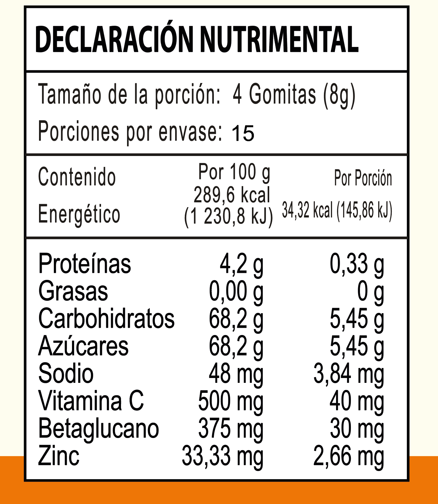• Fórmula con vitamina C, zinc y betaglucano que refuerzan el sistema inmunológico.